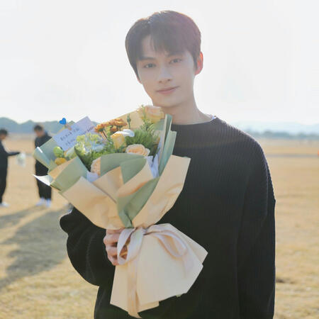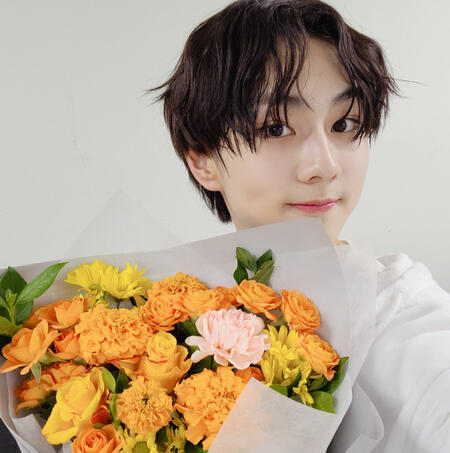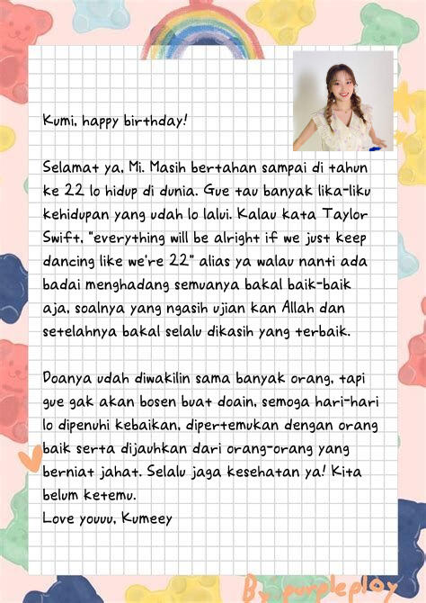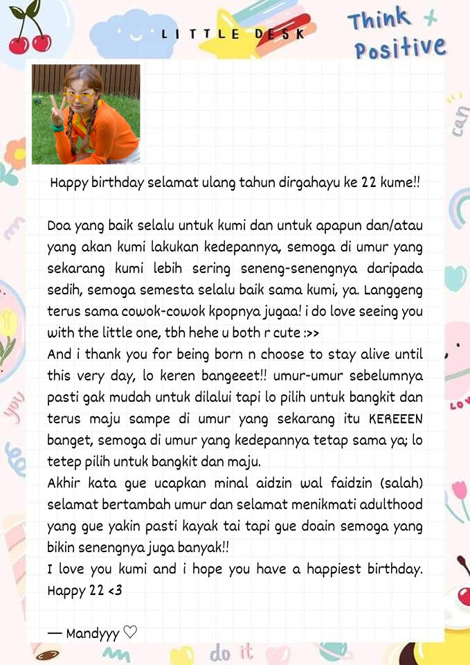 "Happy birthday kumiiiiiiiii. Lah bisa ulang tahun juga lu ya, tapi gua keren banget masih inget. Kirain kayak peterpan hahaha borahae (bunganya)"