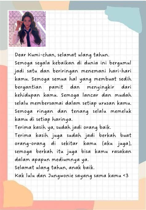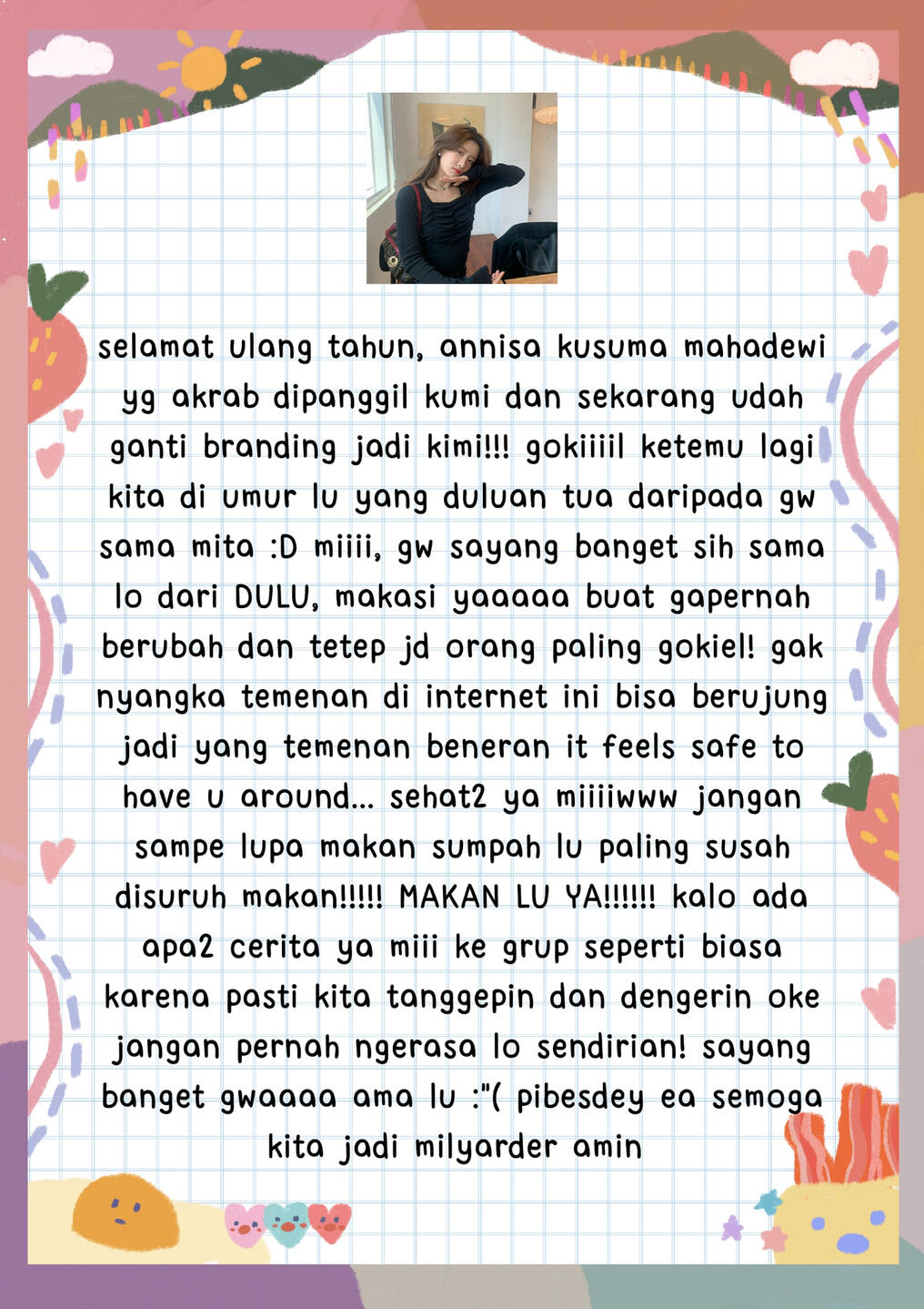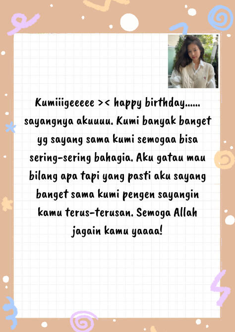 "Selamat ulang tahun ya kumi. Panjang umur serta mulia. Jangan lupa istirahat, jangan terlalu memaksakan diri. Loh kok kesannya gue udah tua banget"