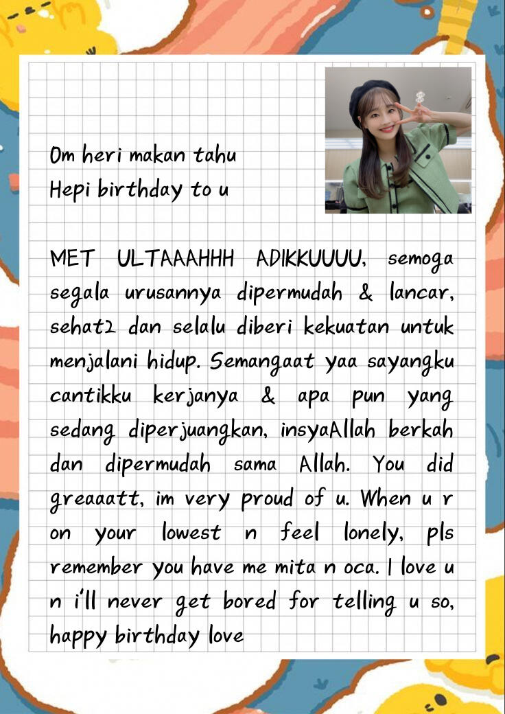 "Happy birthday, bb. Semoga kamu selalu sayang aku dalam diam. Jangan lupa bahagia. Gak nyiapin kado tapi bisa lah pukis buat kamu (sumpah disuruh sama si Sadam)"